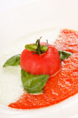 wypchany podglądacz z sosem pomidorowym w białym talerzu, zielone tło