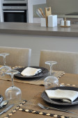 Zdjęcie "Nowoczesna jadalnia ze stołem. Mała głębokość pola" może być wykorzystywane do celów osobistych i komercyjnych zgodnie z warunkami zakupionej licencji Royalty-free. Obraz jest dostępny do pobrania w jakości wysokiej rozdzielczości do 5760x3840.