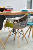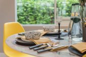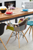 Nowoczesna jadalnia ze stołem. Mała głębokość pola