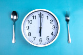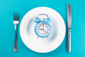 Zdjęcie "Jeden zabytkowy zegar z widelcem i nożem na ciemnym drewnianym stole widok z góry. Vintage odcień kolorów. Najlepsze widoki." może być wykorzystywane do celów osobistych i komercyjnych zgodnie z warunkami zakupionej licencji Royalty-free. Obraz jest dostępny do pobrania w jakości wysokiej rozdzielczości do 5760x3840.