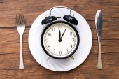 Jeden zabytkowy zegar z widelcem i nożem na ciemnym drewnianym stole widok z góry. Vintage odcień kolorów. Najlepsze widoki.