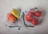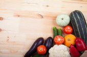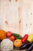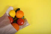Pomidory spożywcze, ogórki, daikon, makaron, cytryna i pomarańcza w papierowej torbie leżą na jasnym tle. Zero odpadów. Ekologia