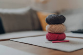 Blisko kulki z przędzy wewnątrz koszyka, z dużymi drewnianymi drutami dziewiarskimi, płytkie ostrość.