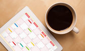 Tablet pc kalendarz wyświetlone na ekranie przy filiżance kawy na d