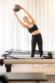Kobieta wykonująca sto ćwiczeń pilates na zreformowanym łóżku w siłowni dla stabilności rdzenia, oddychania i treningu sercowo-naczyniowego