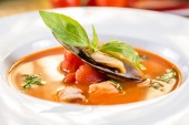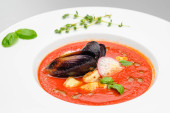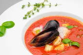 Czerwona pikantna zupa z owoców morza z krewetkami z małżami