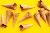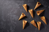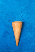 Pięć stożków waflowych na teksturowanym niebieskim tle w widoku z góry