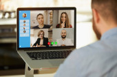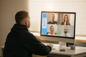Zdjęcie "Tylny widok kobiety, która pracuje zdalnie słuchając raportów pracowników na odprawie online w swoim studio. Nauczycielka słuchająca uczniów na rozmowie wideo na komputerze stacjonarnym w domu." może być wykorzystywane do celów osobistych i komercyjnych zgodnie z warunkami zakupionej licencji Royalty-free. Obraz jest dostępny do pobrania w jakości wysokiej rozdzielczości do 5760x3840.