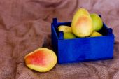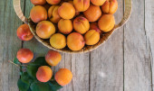 Świeża morela na worku na czarnym drewnianym stole. Dojrzałe jagody w kropelkach wody