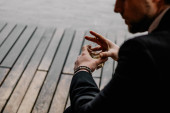 odważny brutalny mężczyzna ubrany w garnitur ze szklanką mocnego alkoholu i papierosem w ręku siedzi na podwórku swojego domu