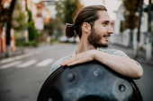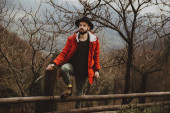 portret stylowego młodzieńca z brodą i nowoczesną fryzurą rozglądającego się po terenie Karpat