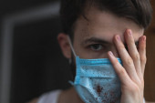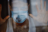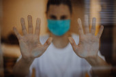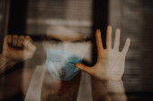 selektywne skupienie, efekt hałasu: kobieta nosząca maskę medyczną podczas pandemii chorób wirusowych jest objęta kwarantanną w domu