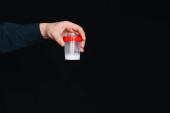 Ręczne trzymanie pustego plastikowego pojemnika na białym tle