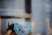 poddana kwarantannie młoda kobieta w domu wyglądająca przez okno z napisem na dłoni: COVID 19 oznaczającym ostrzeżenie przed zakażeniem koronawirusem