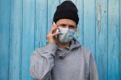 młody mężczyzna wygląda przez okno z napisem: STAY HOME na dłoni, która jest przymocowana do szyby