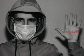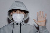 młody mężczyzna wygląda przez okno z napisem: STAY HOME na dłoni, która jest przymocowana do szyby