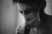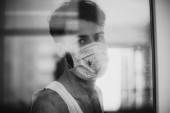 Portret młodego człowieka w masce ochronnej i kwarantannie w domu. Pojęcie dobrowolnej samowystarczalności pacjentów i osób z objawami koronawirusowymi