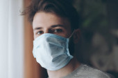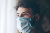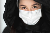 Młoda kobieta w masce medycznej pokazuje znak dłoni, co oznacza, że to tajemnica i musi milczeć. Medyczna koncepcja rozprzestrzeniania się chorób wirusowych i kwarantanny