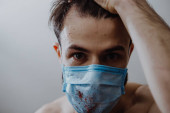 obowiązkowa maska medyczna dla każdego, kto opuszcza dom podczas kwarantanny. Zdjęcie młodego mężczyzny w kurtce i masce medycznej
