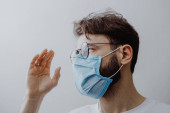 Portret mężczyzny w masce medycznej podczas epidemii koronawirusa. objawy niebezpiecznej choroby wirusowej: ból gardła, kaszel, gorączka