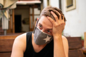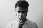 Portret mężczyzny w masce medycznej podczas epidemii koronawirusa. objawy niebezpiecznej choroby wirusowej: ból gardła, kaszel, gorączka