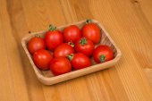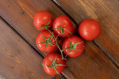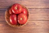 wiele świeżych czerwonych pomidorów w tkanym koszu drewna tło zbliżenie