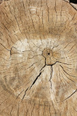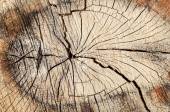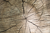 Widok powierzchni czołowej ściętej brzozy porośniętej pajęczynami pęknięć. Struktura i pęknięcia suszonego drewna tworzą unikalny wzór. Tło drewna.