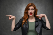 Zdjęcie "Portret białej aktorki z rudymi włosami okazującej radosne emocje. Zdjęcie zrobione w studio na beżowym tle. Model ma na sobie czerwoną koszulę.." może być wykorzystywane do celów osobistych i komercyjnych zgodnie z warunkami zakupionej licencji Royalty-free. Obraz jest dostępny do pobrania w jakości wysokiej rozdzielczości do 5760x3840.