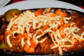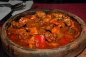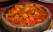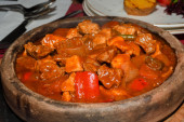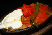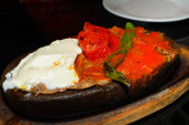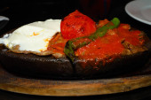 Tureckie plasterki pastrami. krojenie i krojenie Pastirmy, tureckiego mięsa suszonego powietrzem. Pieczone plastry pieczonej wołowiny z pastrami z ziarnami kolorowej papryki na Wielkim Bazarze