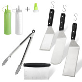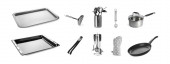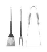 Grill i narzędzia do grillowania ustawione na białym tle. Spatula, skrobak, szczypce, butelka, żelazo wciąż.