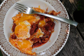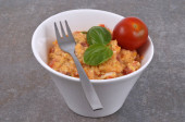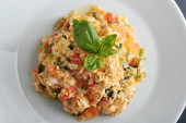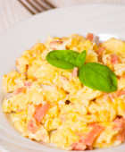 Miska jajecznicy domowej roboty z liśćmi bazylii i zbliżeniem pomidorów wiśniowych