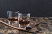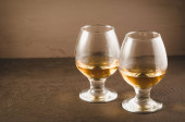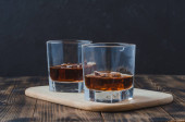 Szklanka brandy z kostkami lodu / Szklanka brandy z kostkami lodu na czarnej tacy. Czarne tło z copyspace.