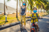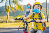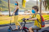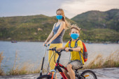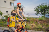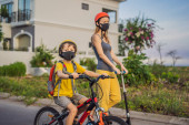 Zdjęcie "Aktywny chłopiec ze szkoły i jego mama w masce medycznej i kasku bezpieczeństwa jazdy na rowerze z plecakiem w słoneczny dzień. Szczęśliwe dziecko na rowerze w drodze do szkoły. Musisz iść do szkoły w masce z powodu" może być wykorzystywane do celów osobistych i komercyjnych zgodnie z warunkami zakupionej licencji Royalty-free. Obraz jest dostępny do pobrania w jakości wysokiej rozdzielczości do 5760x3840.