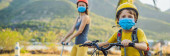 Aktywny chłopiec ze szkoły i jego mama w masce medycznej i kasku bezpieczeństwa jazdy na rowerze z plecakiem w słoneczny dzień. Szczęśliwe dziecko na rowerze w drodze do szkoły. Musisz iść do szkoły w masce z powodu