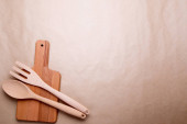 Drewniana łyżka i widelec na stole. Drewniany widelec i łyżka leżą na brązowym drewnianym stole. Akcesoria kuchenne. Miejsce na tekst
