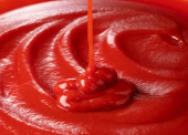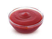 Kąt ujęcia ketchupu w szklanej misce na białym tle