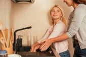 Widok z boku uśmiechnięta matka i córka patrząc w aparat podczas cięcia jabłko na stole kuchennym