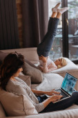Selektywne skupienie kobiety pracującej na laptopie w pobliżu córki na kanapie