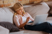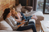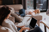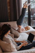 Selektywne skupienie kobiety korzystającej z laptopa w pobliżu córki na kanapie w salonie
