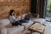 Selektywne skupienie kobiety pracującej na laptopie w pobliżu uśmiechniętej córki stojącej na kanapie