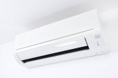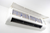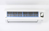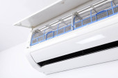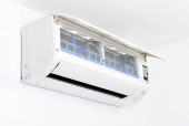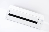 Klimatyzator na białej ścianie. Klimatyzacja.Biały klimatyzator jest zainstalowany na białej ścianie w mieszkaniu.