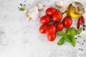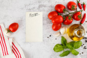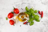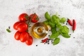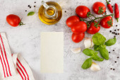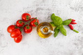 Świeże kolorowe pomidory, bazylia i oliwa z oliwek na białym stole. Widok z góry z kopia spac