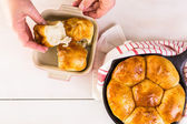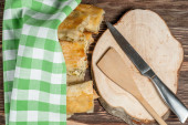 Kobieta biorąc pyszne domowe ciasta ze stołu, widok z góry