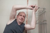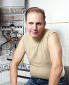 człowiek jest zdenerwowany, gazowy podgrzewacz wody złamał