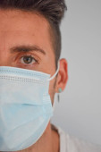 Młody człowiek w masce medycznej, portrecie. Mężczyzna w masce chirurgicznej dla wirusa korony