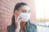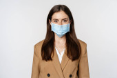 Młoda kobieta w masce medycznej, portrecie. Kobieta w masce chirurgicznej dla wirusa korony