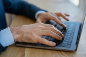 Facet w garniturze piszący kontrakt na laptopie. Koncepcja nabywania uprawnień prawnych do przyjmowania zobowiązań. Noszenie formalne.