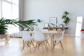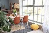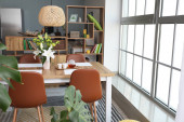 Zdjęcie "Wnętrze nowoczesnej stylowej jadalni z kwiatowym wystrojem" może być wykorzystywane do celów osobistych i komercyjnych zgodnie z warunkami zakupionej licencji Royalty-free. Obraz jest dostępny do pobrania w jakości wysokiej rozdzielczości do 5760x3840.