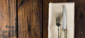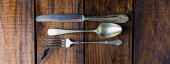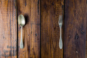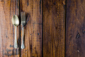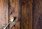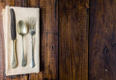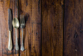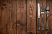 Zestaw sztućców na rustykalnym drewnianym stole. Widelec, łyżka i nóż. Koncepcja jedzenia. Przestrzeń kopiowania