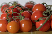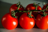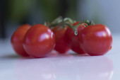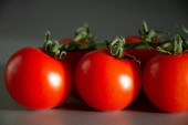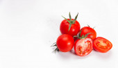 Czerwone pomidory na białym, izolowanym tle. Strzał z niskiego kąta